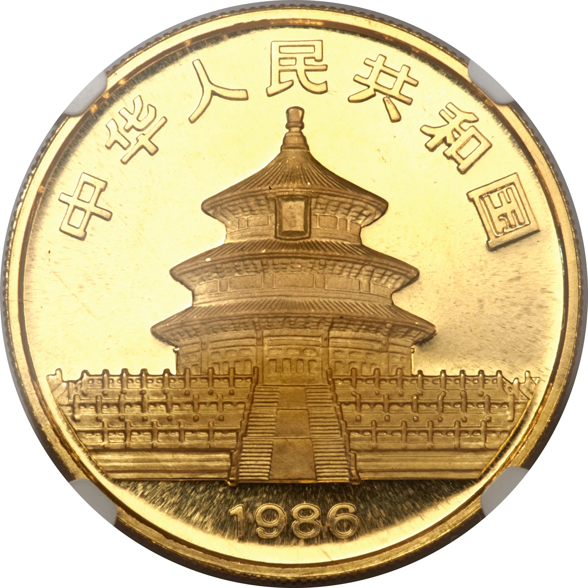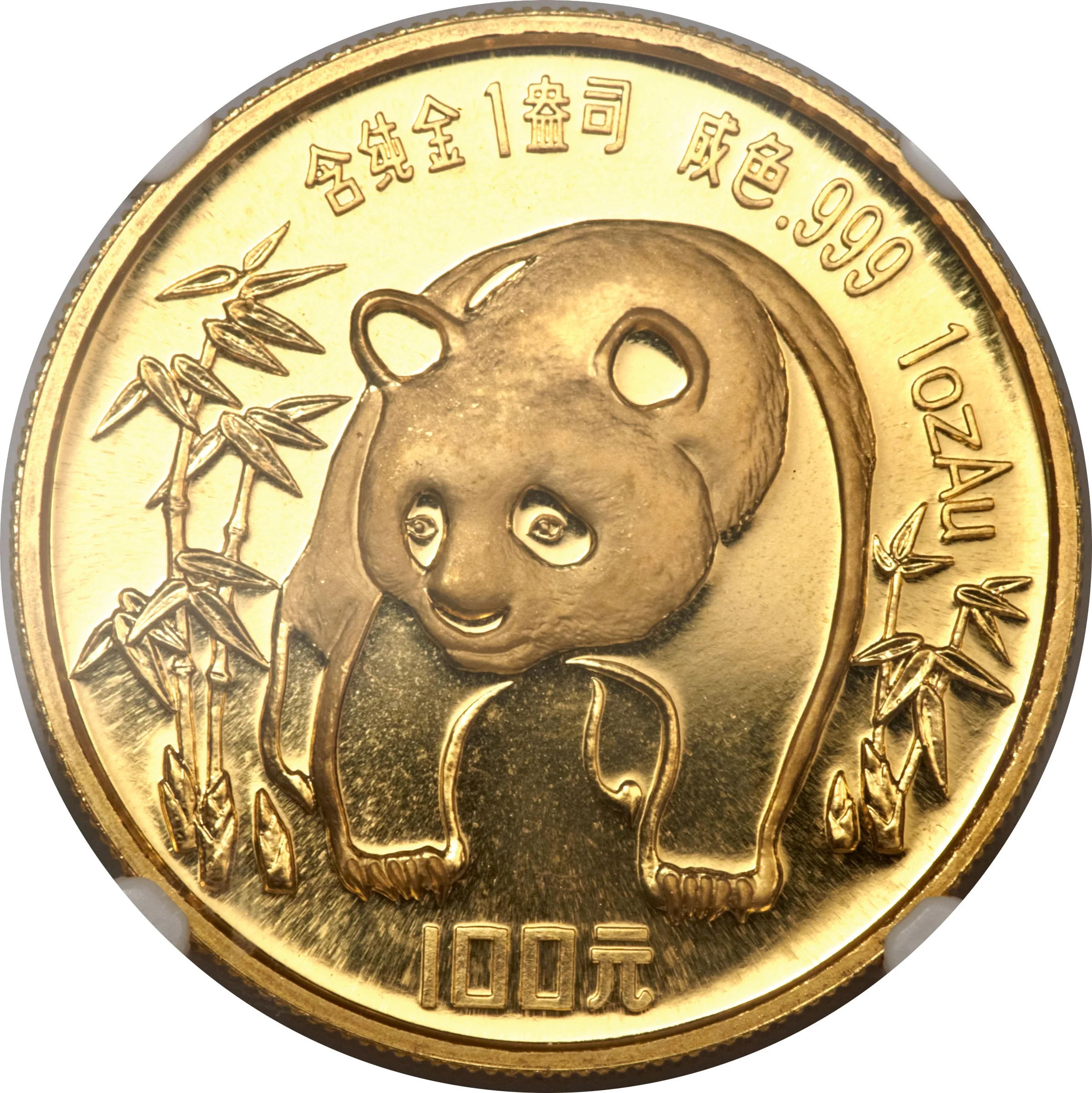 Panda in bamboo with gold content above and denomination below.