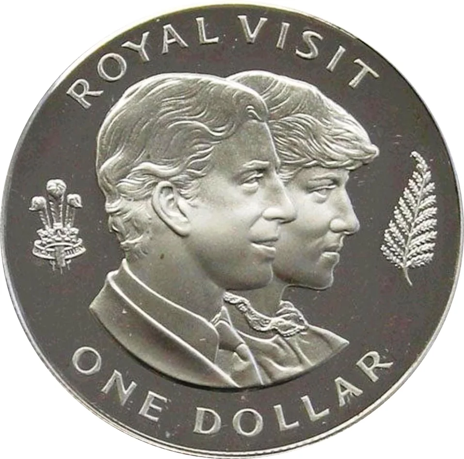 Portraits of the Prince and Princess of Wales, flanked by his crest and a silver fern, with legend above and denomination below.