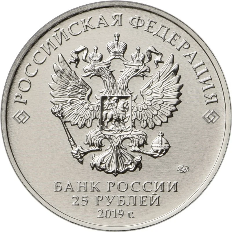 The obverse features the Russian Federation national emblem, above which is "РОССИЙСКАЯ ФЕДЕРАЦИЯ" framed by diamonds. To the right is the mint mark. Below the emblem are the three lines: "БАНК РОССИИ", "25 РУБЛЕЙ", and "2019 г.".