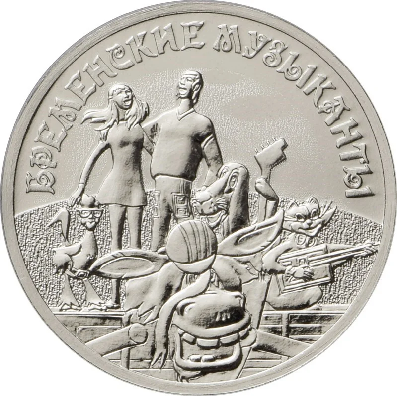 The coin 'The Bremen Town Musicians' features a relief cartoon scene with the title inscribed around its upper edge.