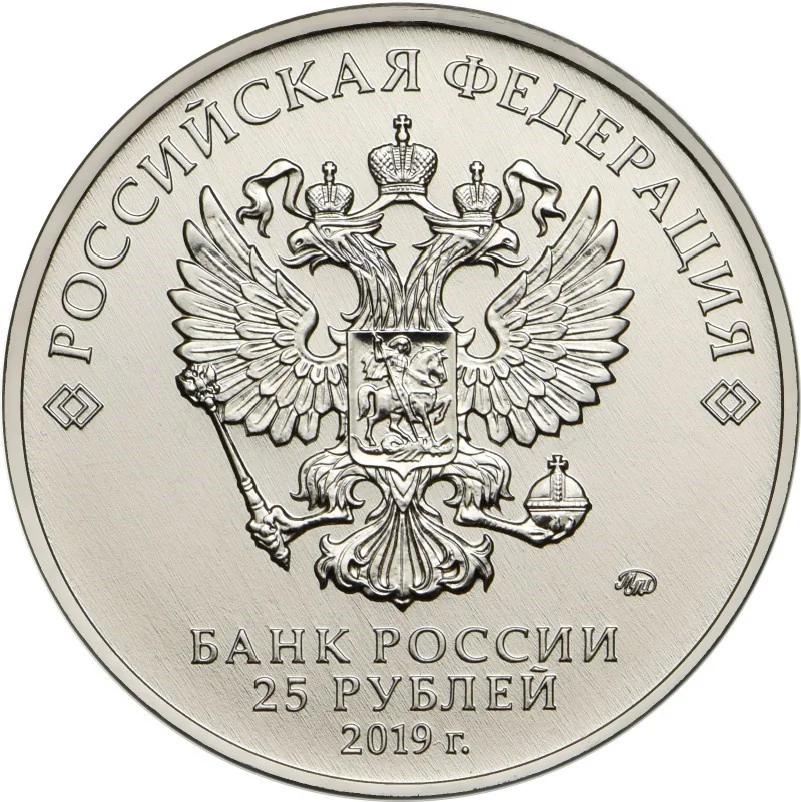 The obverse features the Russian Federation national emblem, above which is "РОССИЙСКАЯ ФЕДЕРАЦИЯ" framed by diamonds. To the right is the mint mark. Below the emblem are the three lines: "БАНК РОССИИ", "25 РУБЛЕЙ", and "2019 г.".