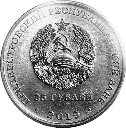 State Emblem of the Transnistrian Moldavian Republic. Circular inscription: top - "ПРИДНЕСТРОВСКИЙ РЕСПУБЛИКАНСКИЙ БАНК" (Transdniest Republican Bank), bottom - "25 РУБЛЕЙ" (25 Roubles). Below the emblem, the year "2019".
