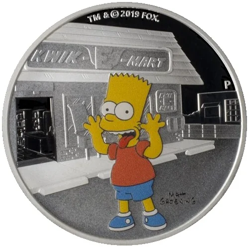 Colorized Bart Simpson making a funny face outside the Kwik-E-Mart.