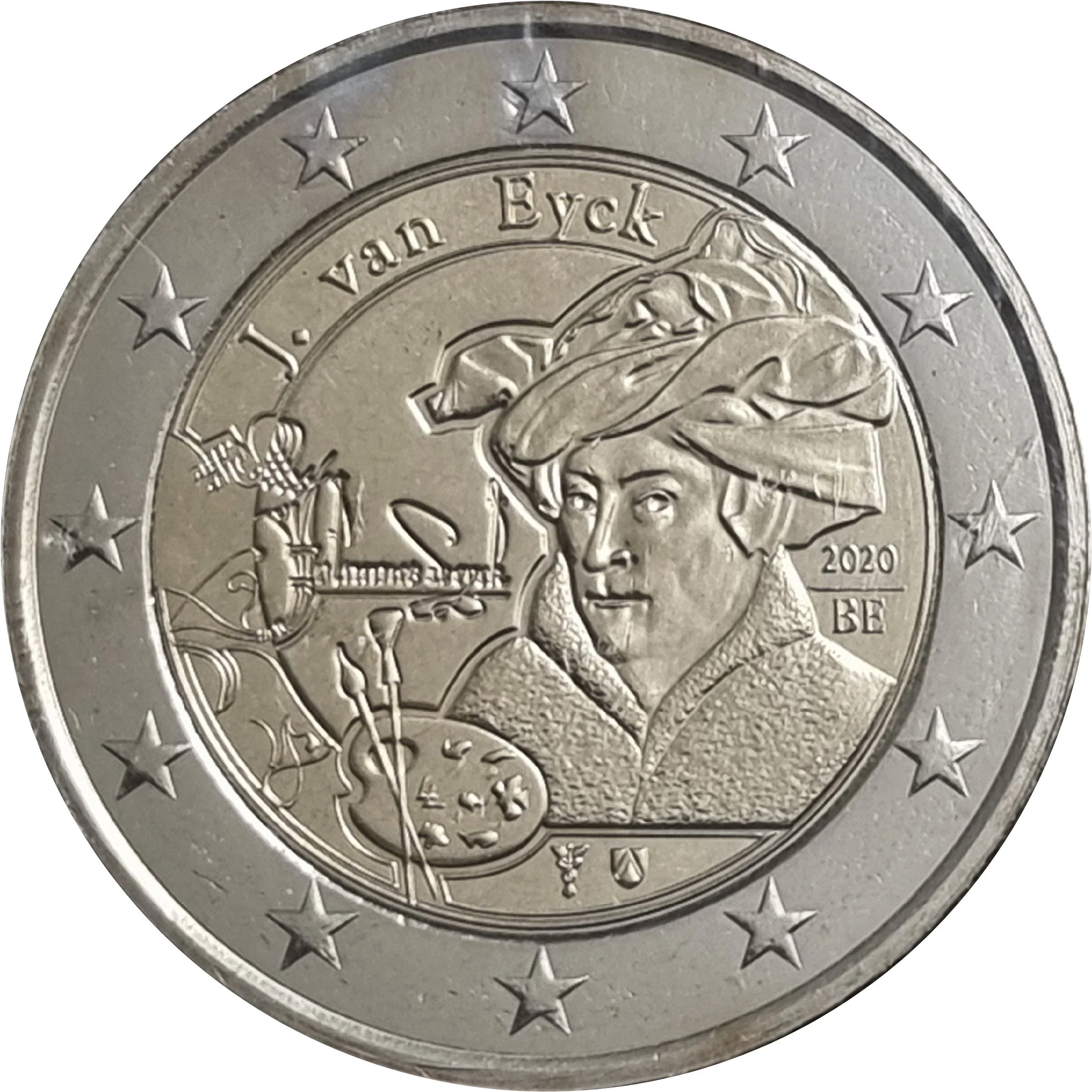The right side features a portrait of Jan van Eyck, with his name, signature, and a palette with designer Luc Luycx's initials on the left. The bottom shows the Utrecht mint mark and the mintmaster's mark. The right edge has "BE" and "2020." The outer ring displays the twelve stars of the European flag.