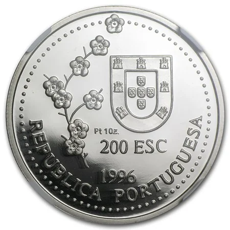 Portuguese coat of arms beside a flowering plum branch, with value and date below.