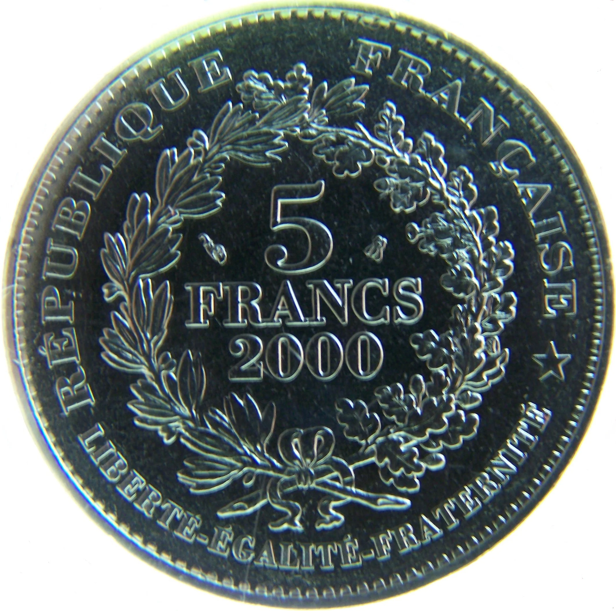 FRANCE 5 FRANCS 2000 - Liberty, Equality, Fraternity within a laurel wreath.