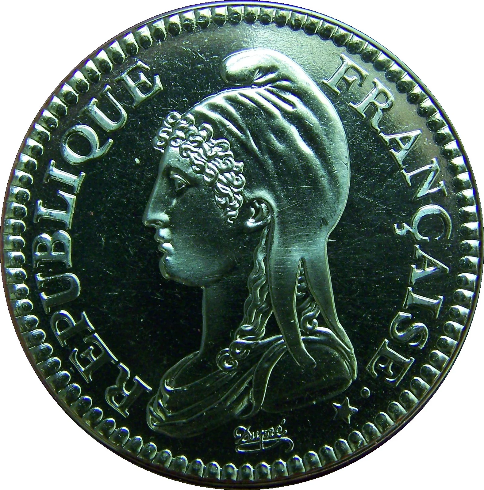 Historical French coin replica: Dupré's Marianne in Phrygian cap, left profile.