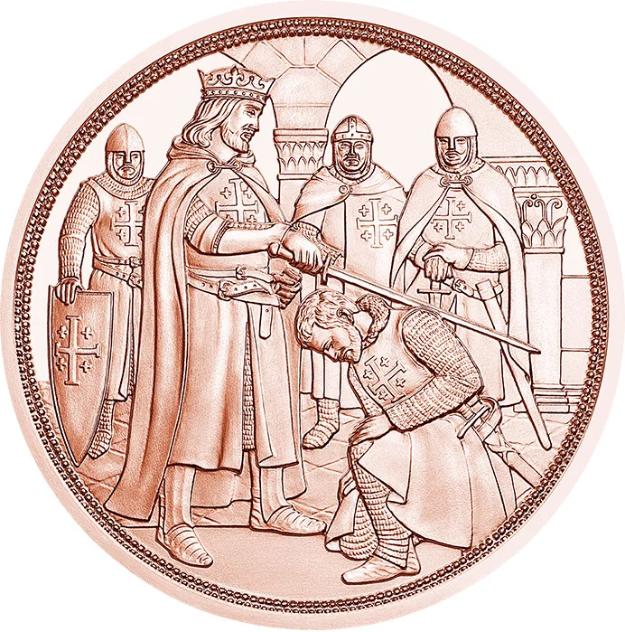 The Jerusalem cross appears centrally, both on the coat of arms and on the armored chest of Godfrey of Bouillon, who stands battle-ready with helmet, chainmail, and a battle axe.