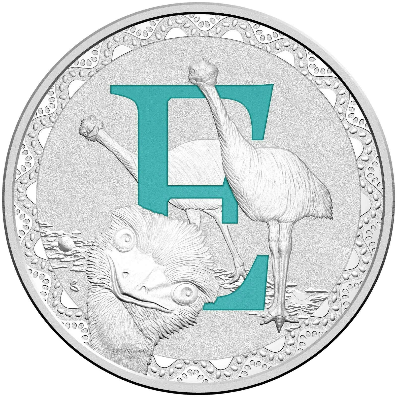 The Letter E Coin depicts an eager Emu engaging with the letter E.