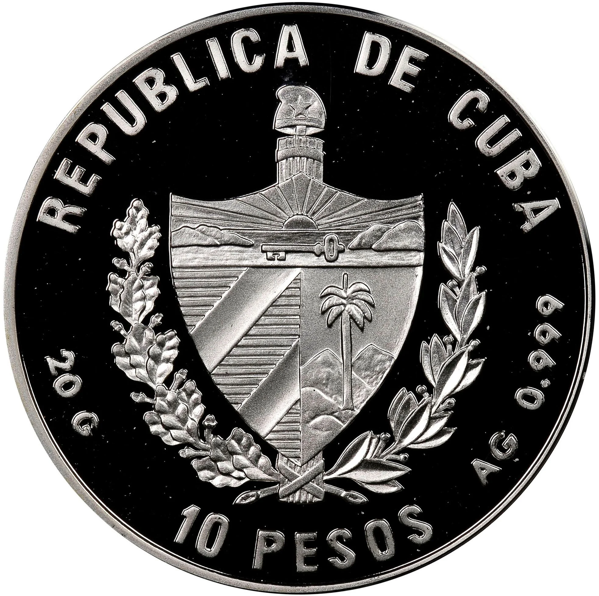 Cuban coat of arms with curved country name above, face value below, and weight and fineness on the sides.