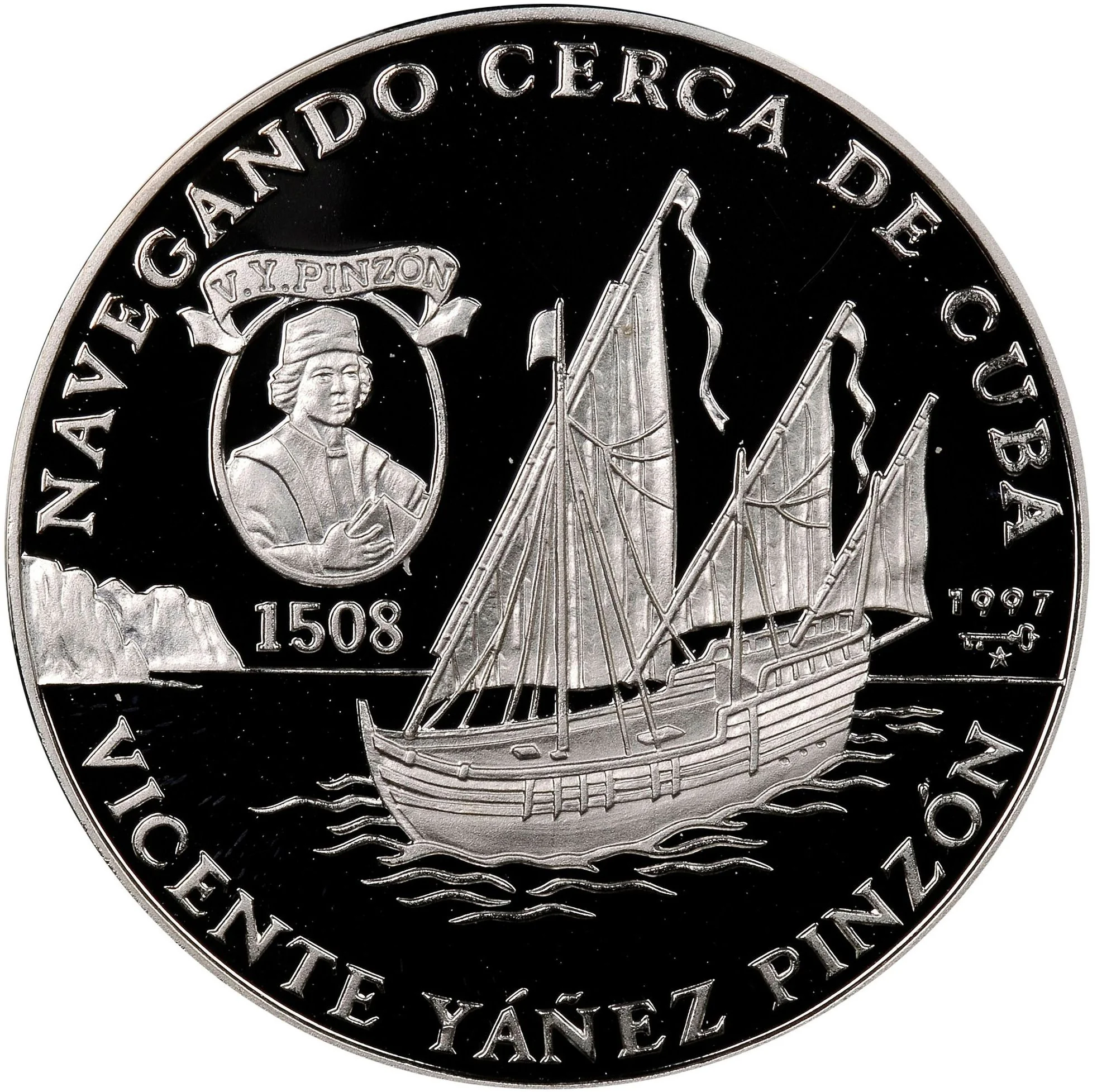 Caravel "La Niña" on Cuba's 1508 circumnavigation, with Vicente Yáñez Pinzón cameo, curved legend above, name below, and mint year/mark at right.