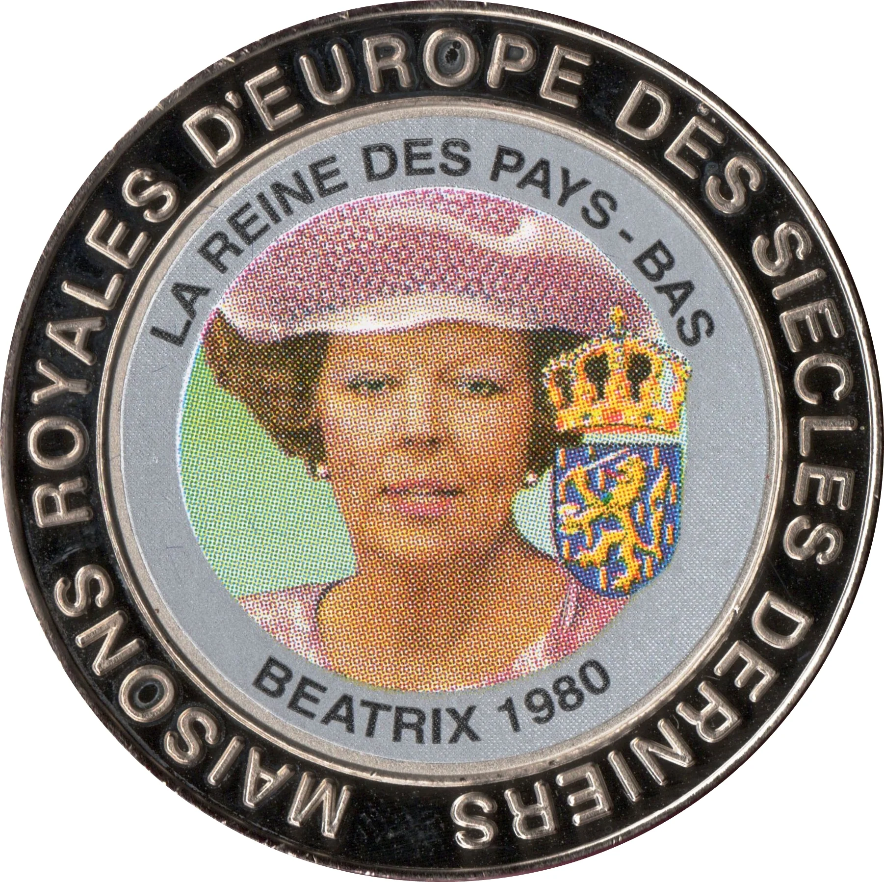 Multicolor portrait of Queen Beatrix in a pink hat, encircled.