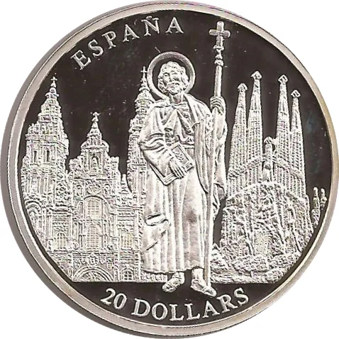 Saint James the Great, patron of Spain, with the Santiago de Compostela and Barcelona's Sagrada Familia basilicas behind.