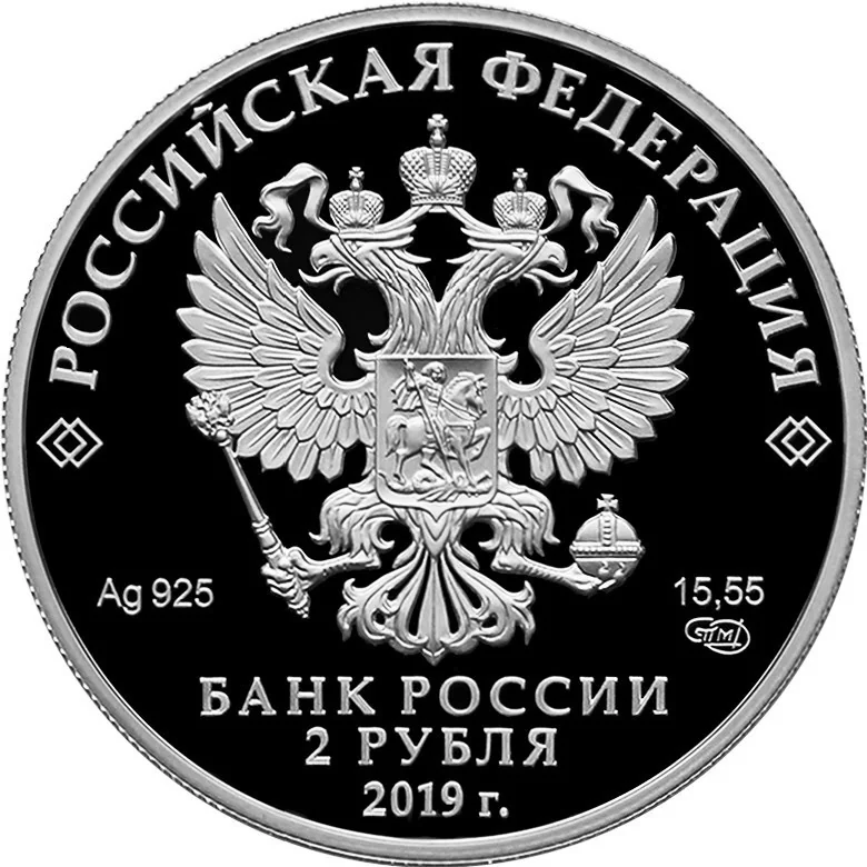 The obverse features the Russian Federation coat of arms with "РОССИЙСКАЯ ФЕДЕРАЦИЯ" above. Below are the metal specifications, mint mark, and the inscriptions "БАНК РОССИИ", "2 РУБЛЯ", and "2019 г.".