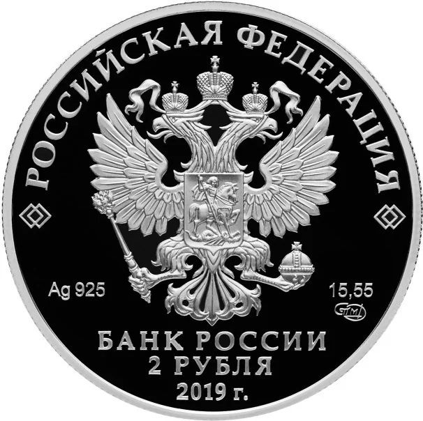 The obverse features the Russian Federation coat of arms with "РОССИЙСКАЯ ФЕДЕРАЦИЯ" above. Below are the metal specifications, mint mark, and the inscriptions "БАНК РОССИИ", "2 РУБЛЯ", and "2019 г.".