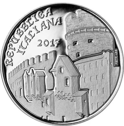 Elements from Trento's Buonconsiglio Castle and the Augustus Tower; on the left, "REPUBBLICA ITALIANA" and "2017"; on the right, the designer's name "PETRASSI".