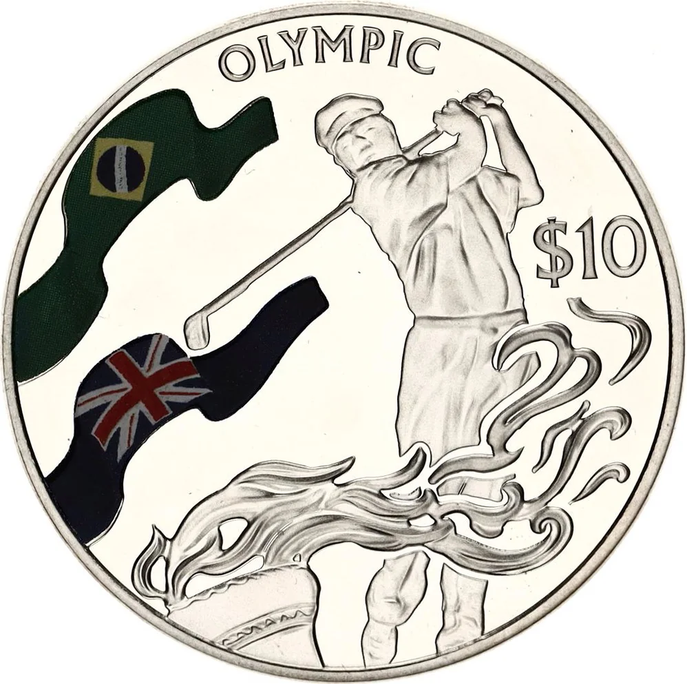 This design marks Golf's return after 112 years, showing a male golfer with a torch. Two ribbons feature the Brazilian flag and the Union Jack.