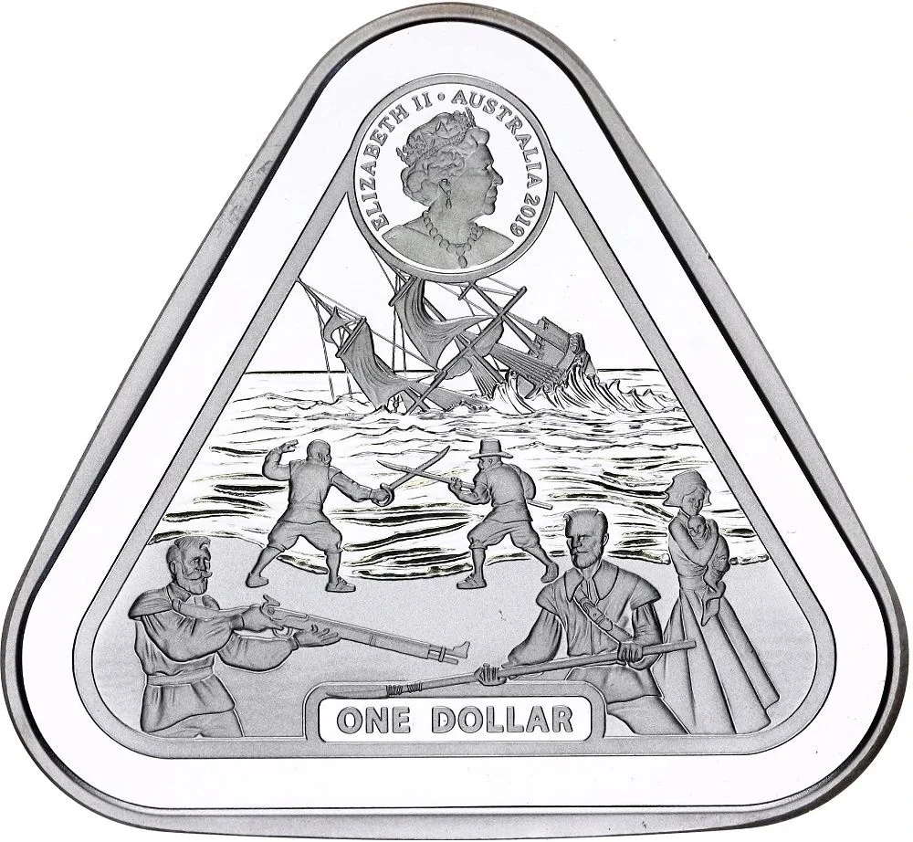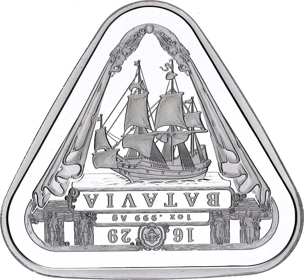 The reverse design shows the Batavia's journey: viewed one way, the ship sails proudly; flipped to read "1629" and "Batavia," it appears capsized after wrecking. The border incorporates unique elements from the ship.
