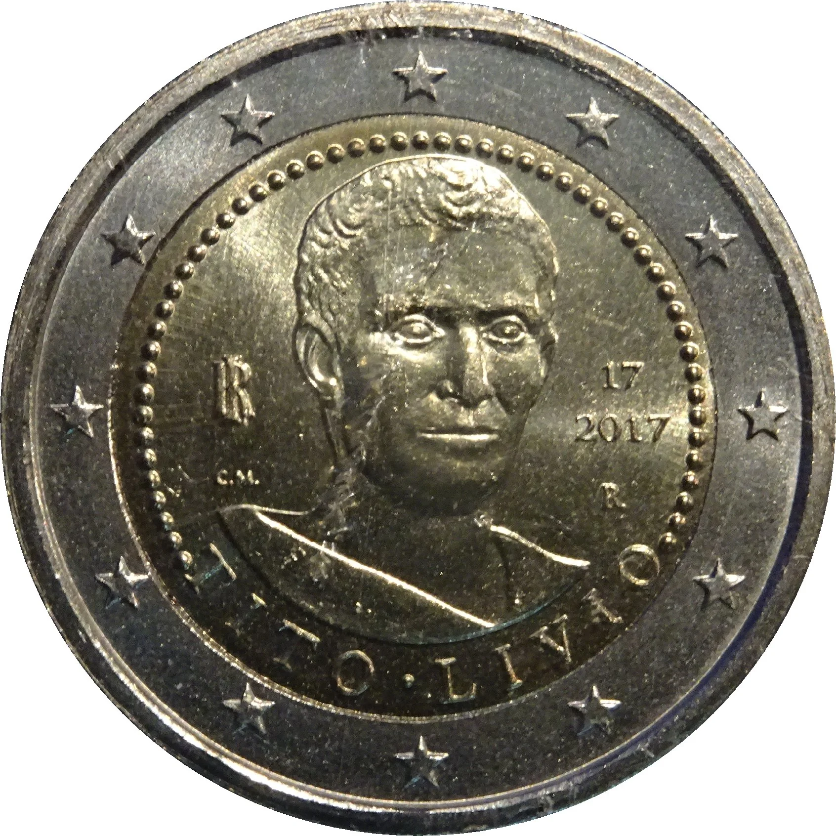 Bust of Roman historian Titus Livius by Lorenzo Larese Moretti. Left: "RI" (Italian Republic) and "C.M." (designer Claudia Momoni). Right: "17" and "2017" (Livius' death and issue year) and "R" (Rome Mint). Encircled by a dotted frame, "TITO • LIVIO", and the twelve stars of the European Union.