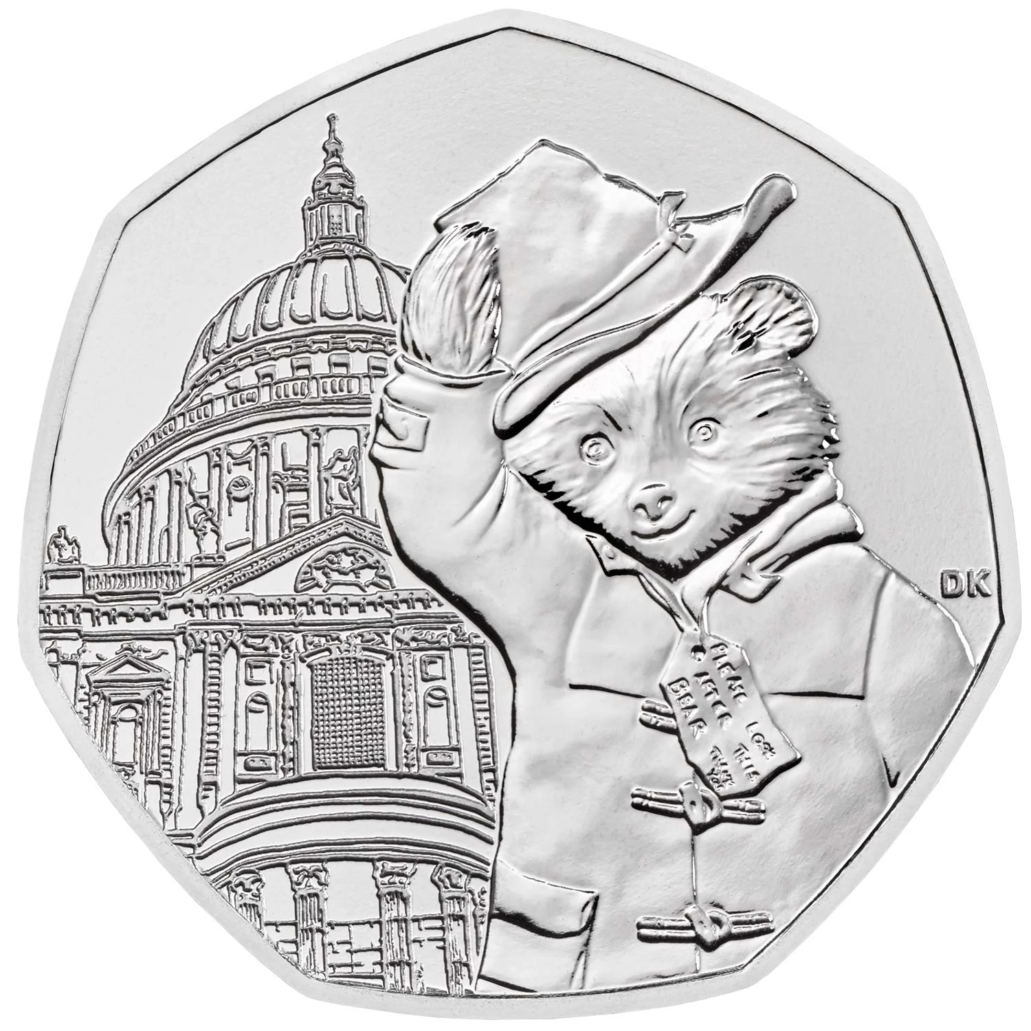 Paddington Bear tipping his hat at St. Paul's Cathedral.