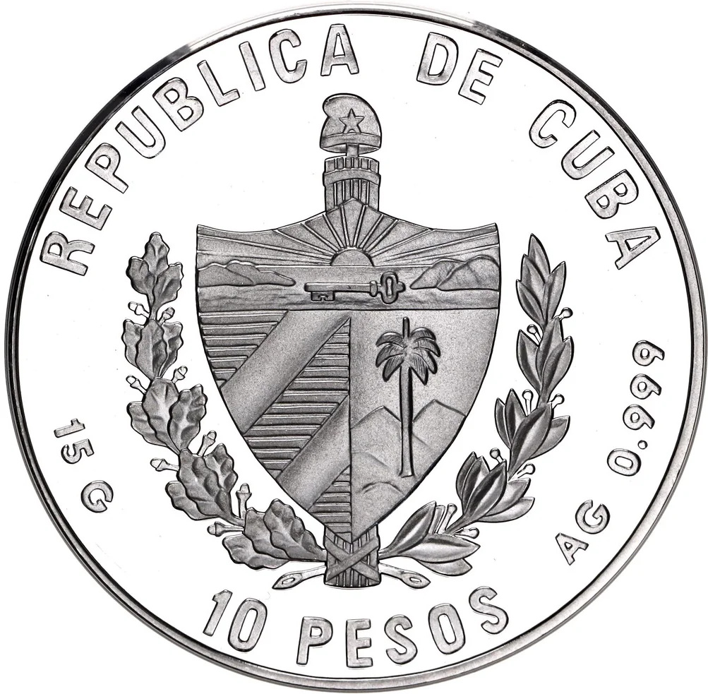 Cuban Coat of Arms with curved country name above, face value below, and fineness and weight on the sides.