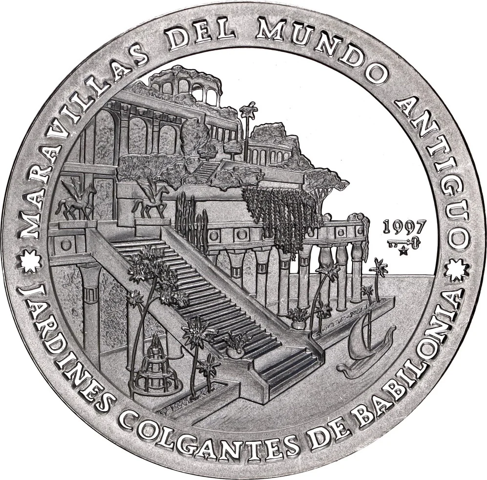 Hanging Gardens of Babylon; legend near edge: event above, location below; date and mintmark at right.