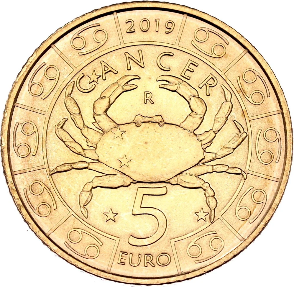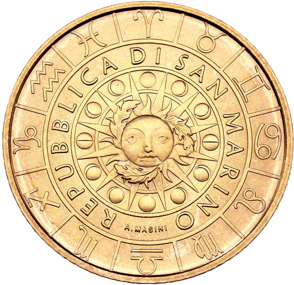 The shared obverse features a central sun surrounded by lunar phases, three feathers symbolizing San Marino, and the twelve astrological signs along the edge.