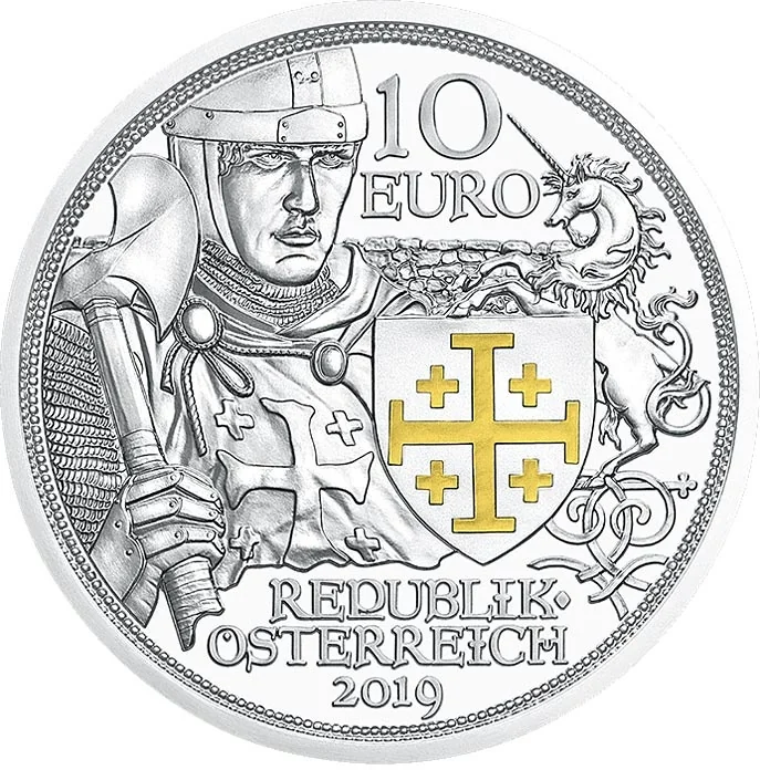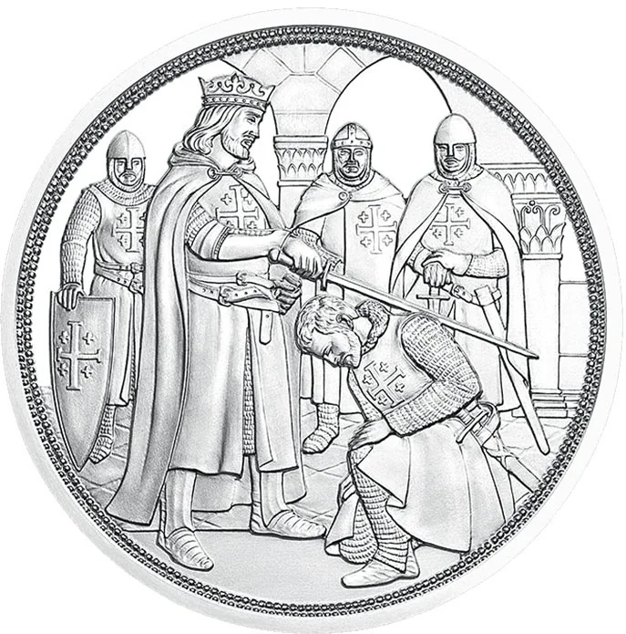 The Jerusalem cross appears centrally, both on the coat of arms and on the armored chest of Godfrey of Bouillon, who stands battle-ready with helmet, chainmail, and a battle axe.