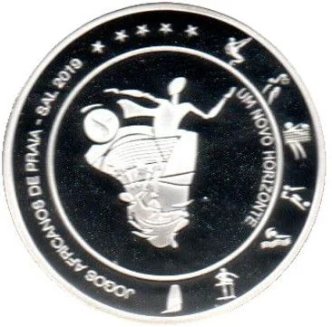 The obverse centers on a swimmer amid waves, with the coin's face value. This is encircled by the country name, chain links, palm leaves, and ten stars representing the islands of Cape Verde.