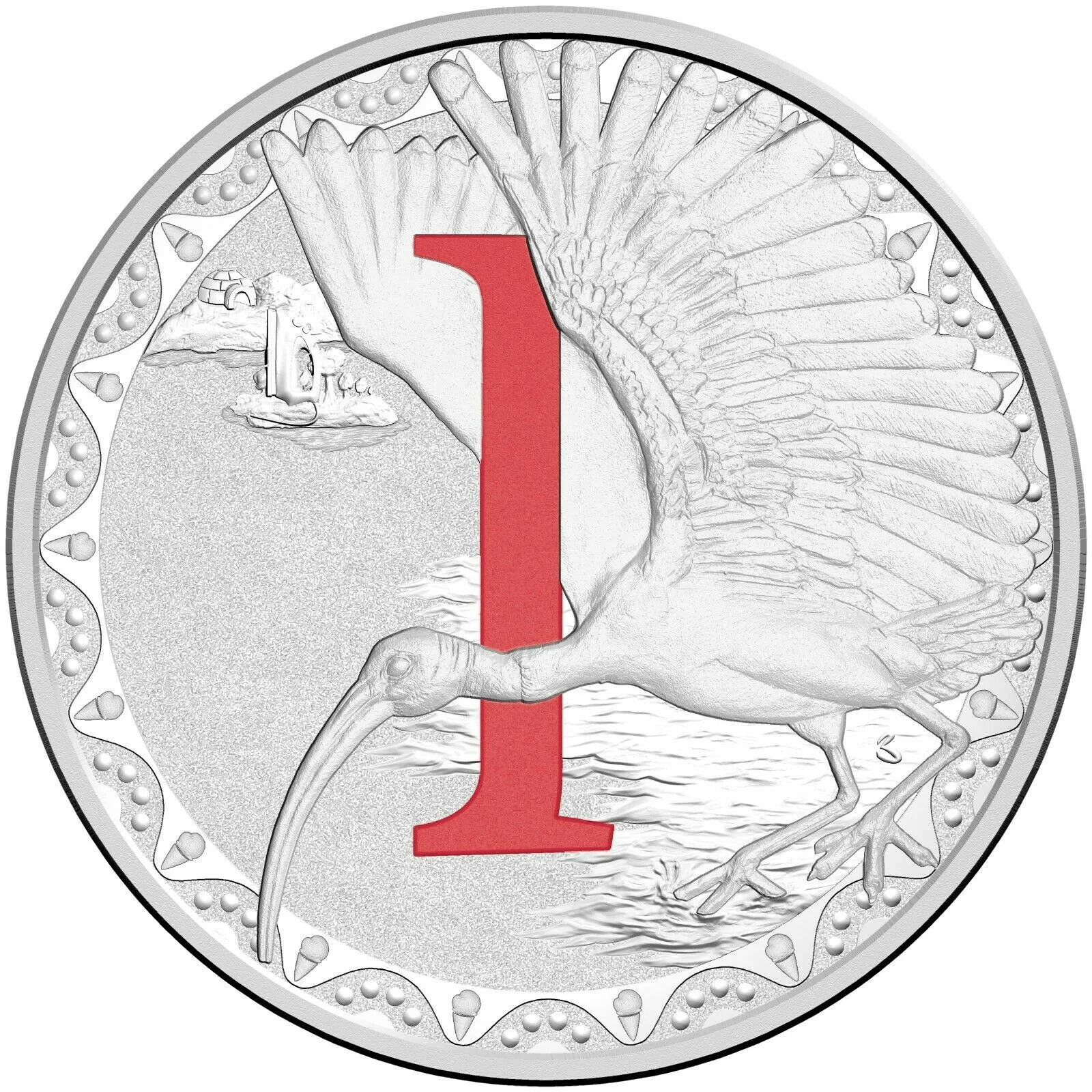 The Letter I Coin features an Ibis playfully interacting with the letter I.