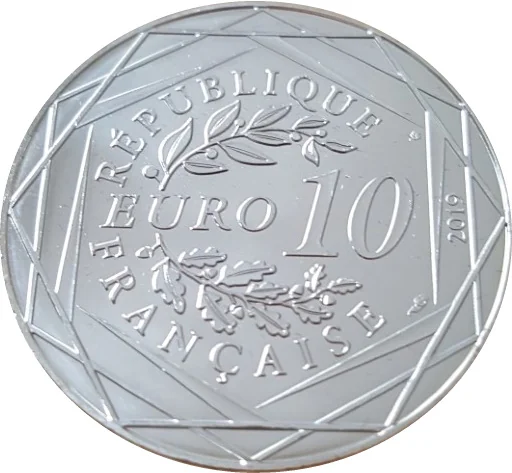 The obverse features the face value with oak and laurel branches, suggesting the Euro sign. The reverse motifs are framed by lines forming France's hexagon.