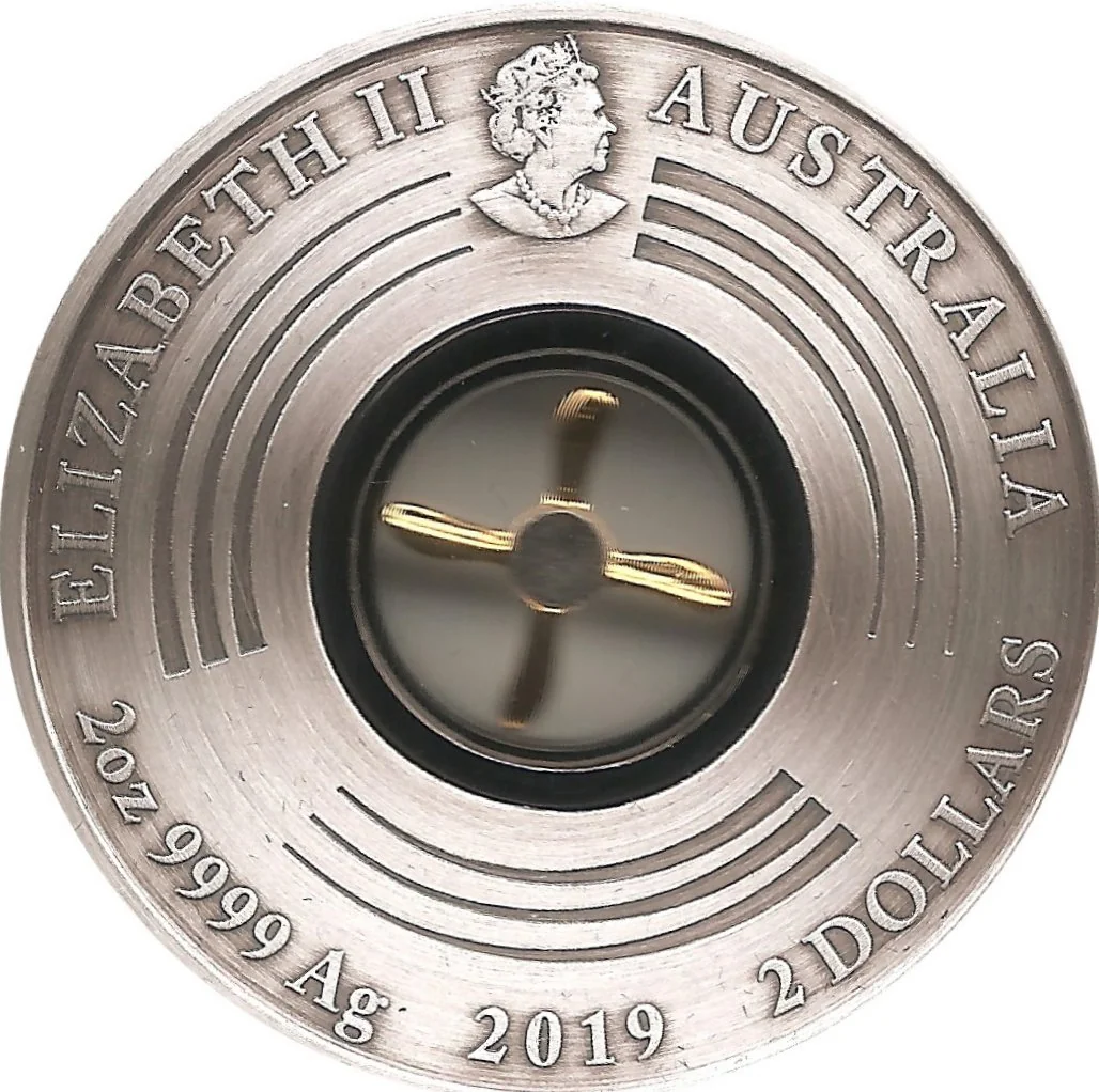 Sixth crowned portrait of Queen Elizabeth II facing right, wearing the George IV State Diadem and Victorian Coronation Necklace. The design includes denomination, specifications, and date. A propeller inset is bordered by a pattern suggesting wind and movement.