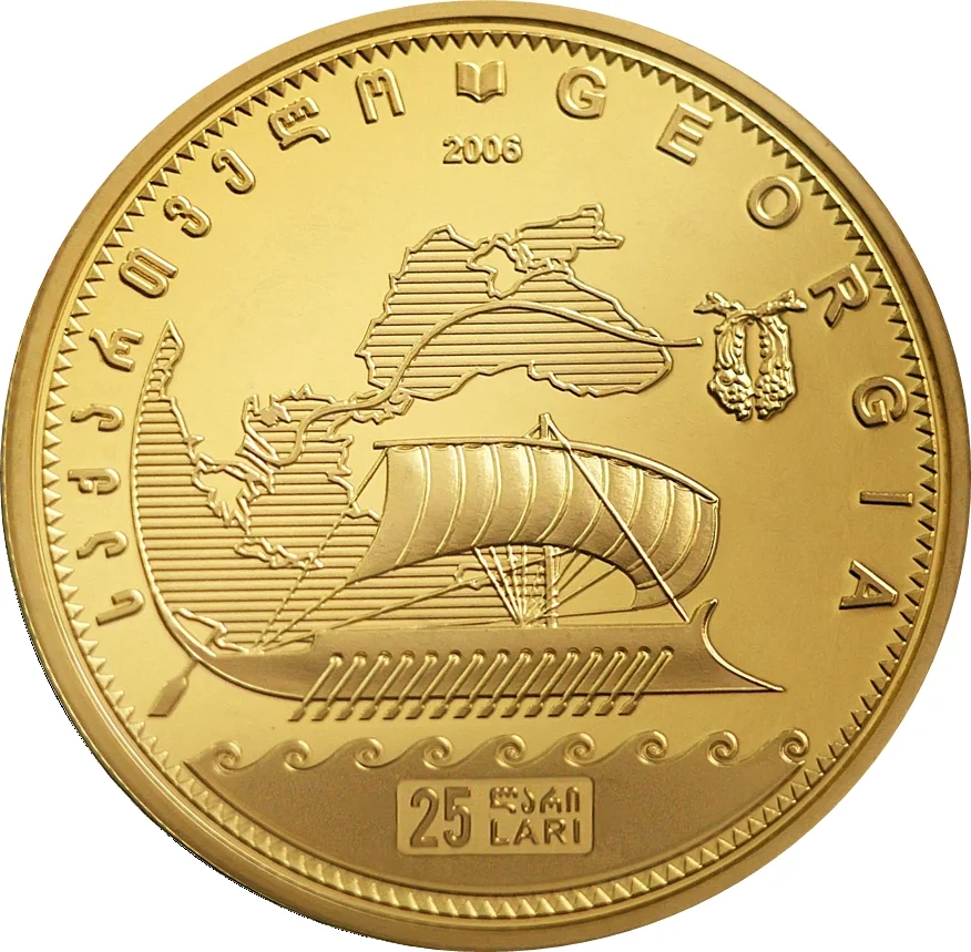 Central image: The ship "ARGO" on a map of the Mediterranean and Black Seas, tracing its route from Greece to Kolkhida. Stylized waves with denomination below. Surrounded by Georgian and English text.