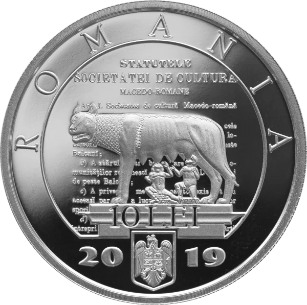 The “Lupa Capitolina” she-wolf, a Latin symbol adopted by the Macedo-Romanian Cultural Society, alongside an excerpt from its charter; the arched inscription “ROMANIA”, face value “10 LEI”, Romania’s coat of arms, and issue year “2019”.