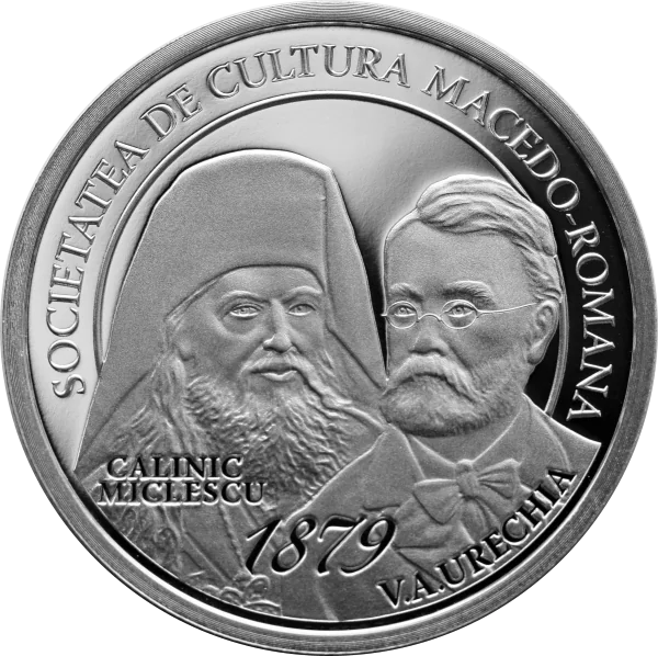 Portraits and names of founding members Calinic Miclescu (Primate Bishop, honorary chairman) and V.A. Urechia (secretary). Above, the arched inscription “SOCIETATEA DE CULTURA MACEDO-ROMANA” and the founding year “1879”.