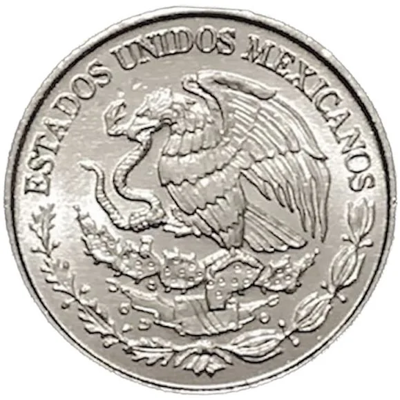 20¢ at center, date above, mint mark Ṁ below. Upper left to lower right: partial border of Reed (Acatl) designs from the Aztec calendar stone.