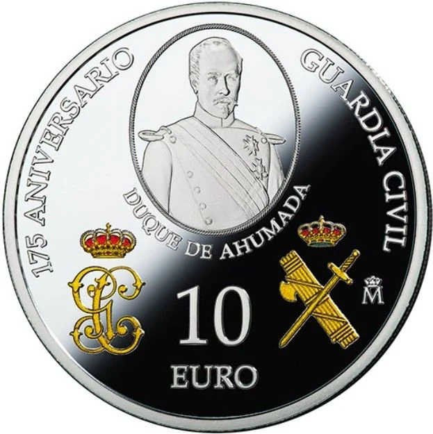 Centered within an oval is a detail from Vicente López Portaña's portrait of Francisco Javier Girón, the Second Duke of Ahumada and founder of the Guardia Civil. Below, on either side, are the Guardia Civil's colored emblems.