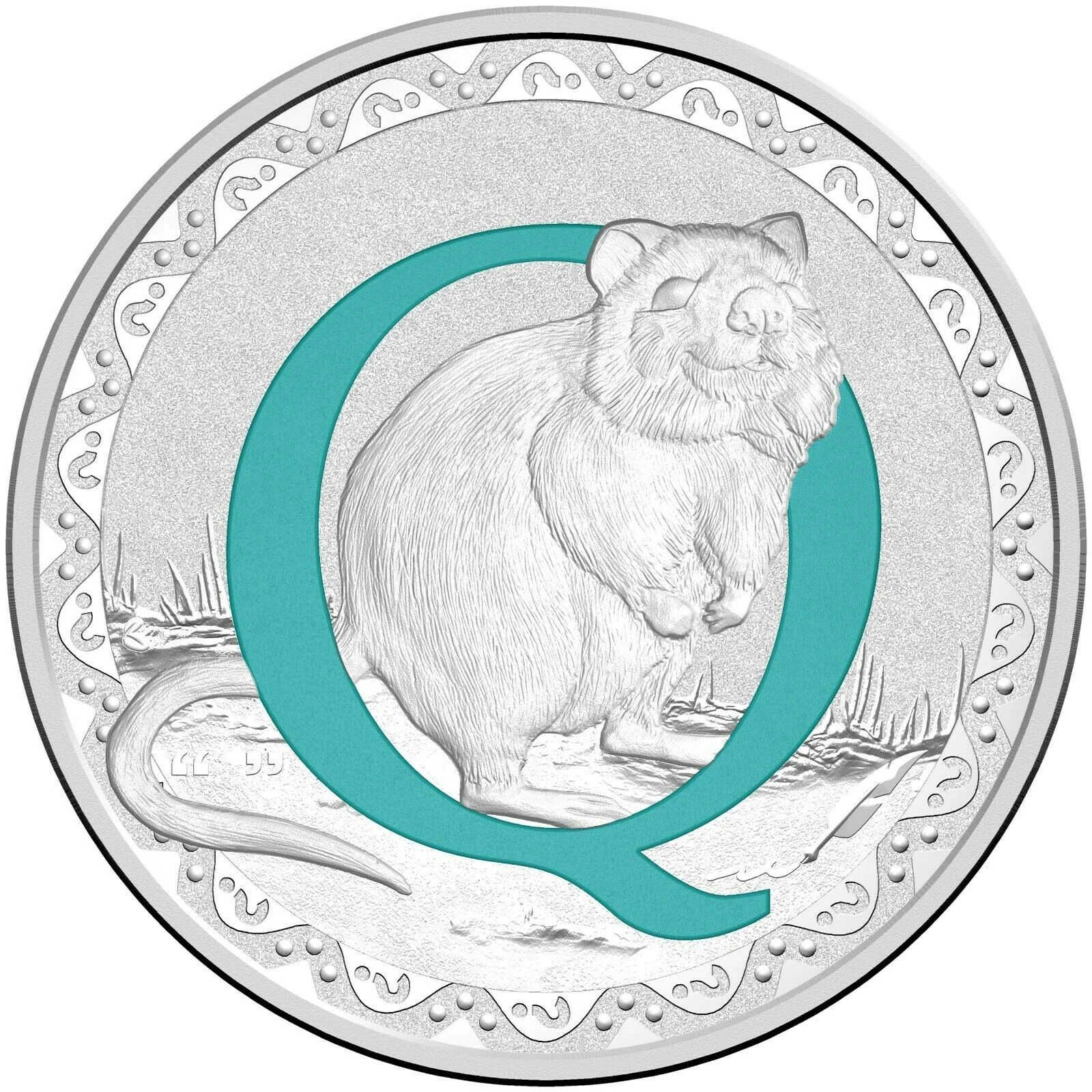 The Q Coin features a quirky Quokka playfully interacting with the letter Q.