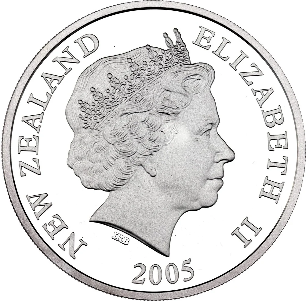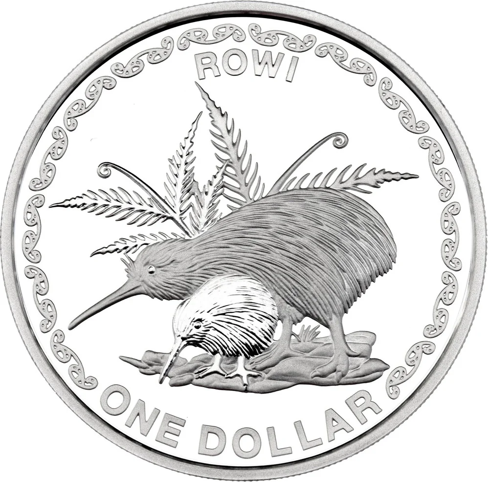 Rowi kiwi and chick. Silver fern within a Maori-patterned ring.
