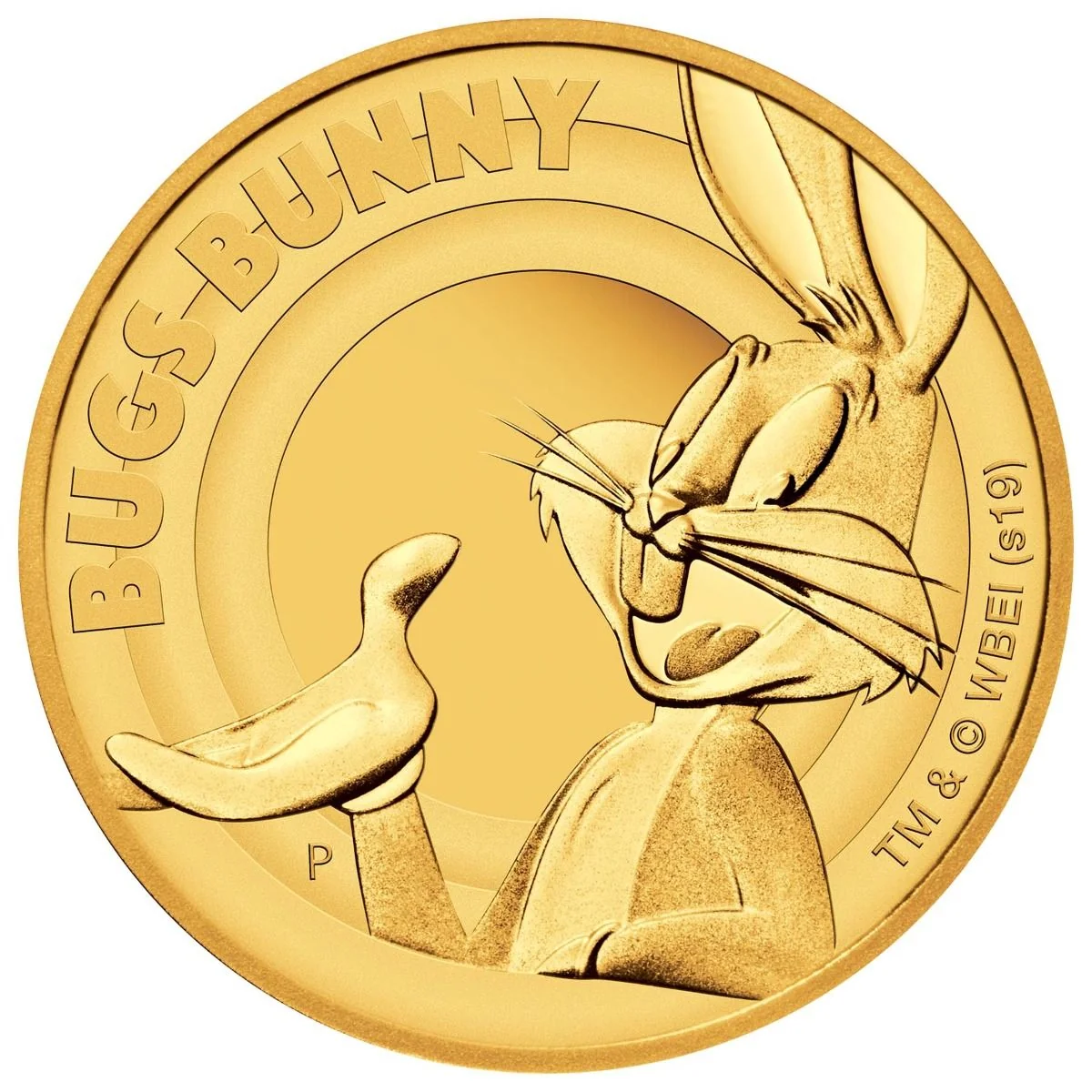 Bugs Bunny smiles and shrugs, buck teeth on full display, emerging from the Looney Tunes rings.