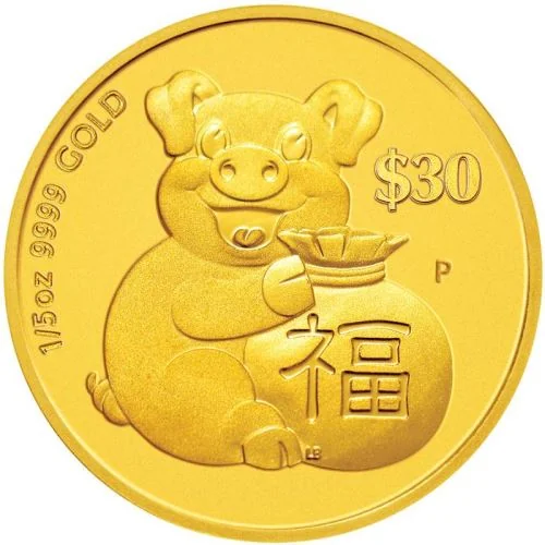 A pig caricature with the prosperity character (fu) and its monetary value.