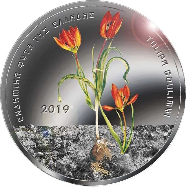 The design features a colored Tulipa Goulimyi flower. The upper edge is inscribed with "ENDEMIC FLORA OF GREECE" (in Greek) and "TULIPA GOULIMYI", encircling the issuance year "2019".