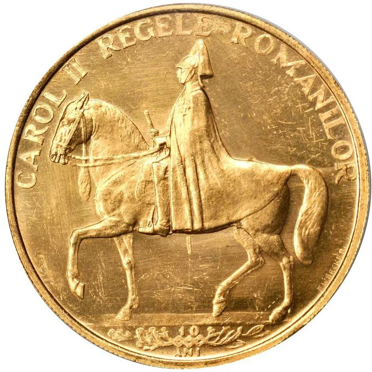 King on horseback left, in royal guard uniform and Order of Michael the Brave cloak, holding a marshal's baton. Exergue with branches and "10 ANI". Engraver E.W. BECKER at bottom left edge.