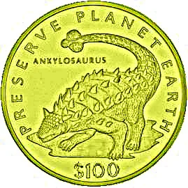 Ankylosaurus facing left with raised tail, denomination below.