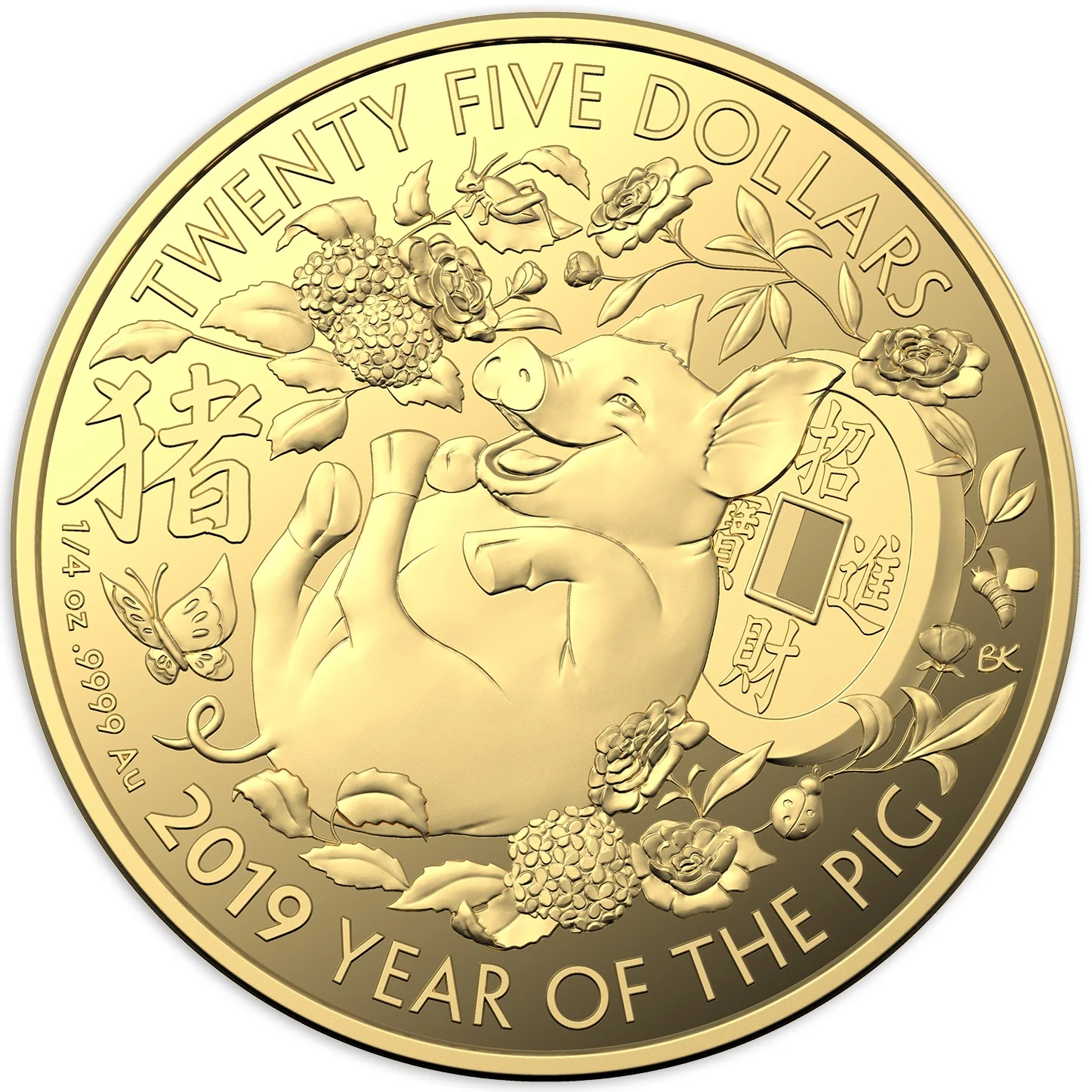 Happy Pig on its back with lucky hydrangeas, a cash coin for wealth (Lu) on the right, and the Chinese character for Pig on the left.