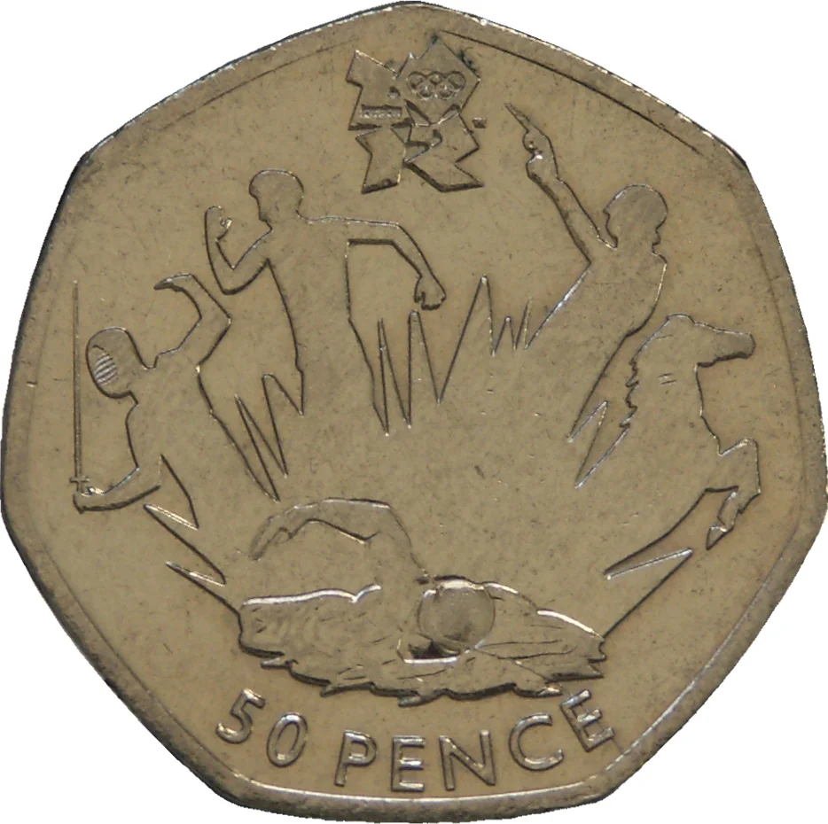 Figures performing modern pentathlon events: fencing, running, shooting, riding, swimming. London 2012 logo above, denomination below.