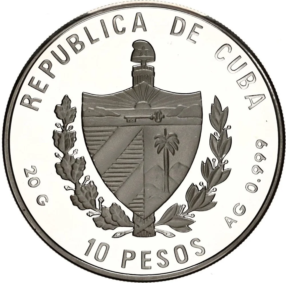 Cuban coat of arms with country name above, face value below, and weight/fineness on the sides.