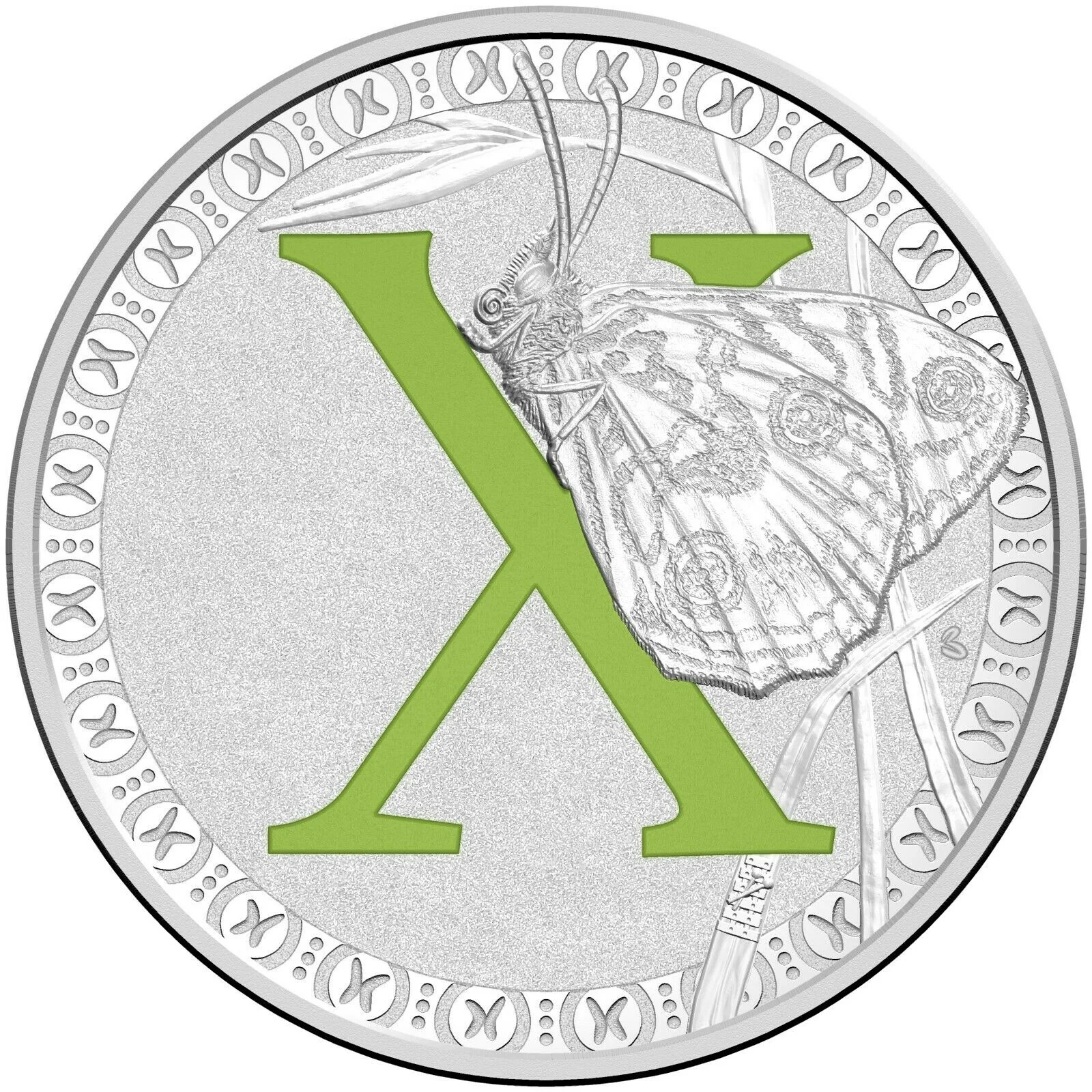 The Xenica Butterfly playfully interacts with the letter X on this coin.