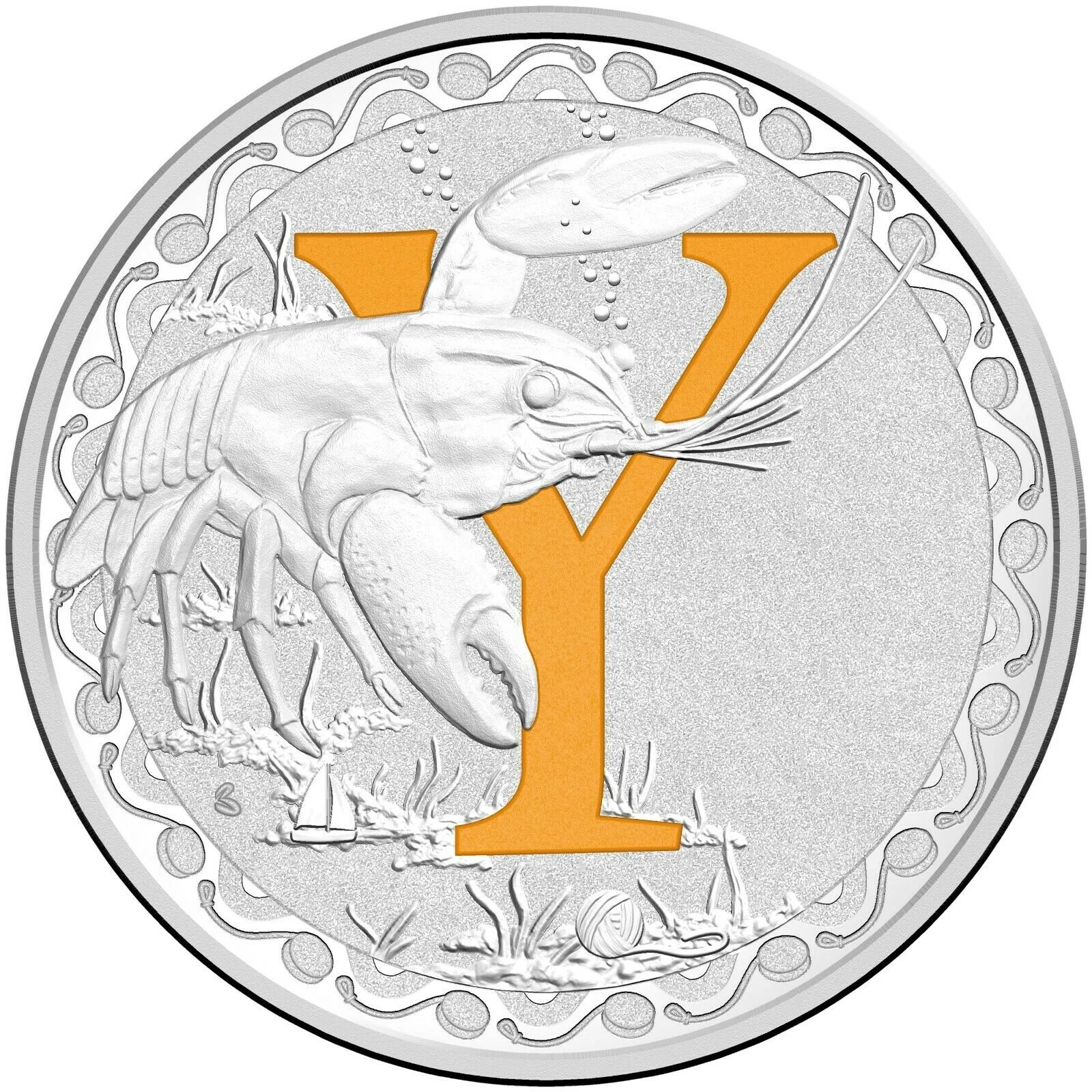 The Yabby playfully interacts with the letter Y on this coin.