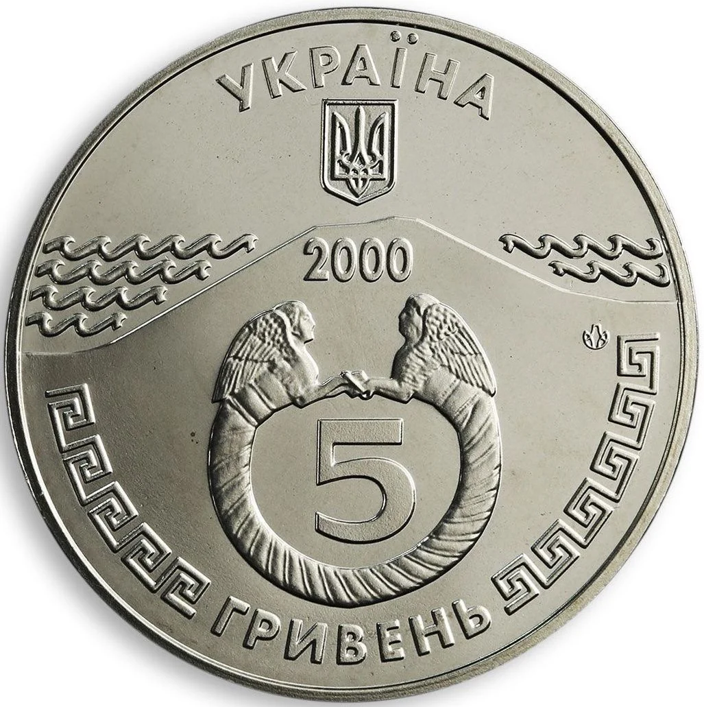Description: The upper section features Ukraine's small National Emblem. The central image shows the Mitrydat hill with a bracelet from the Kul-Oba kurgan. Stylized depictions of the Black and Azov Seas flank the hill, alongside the inscriptions: "УКРАЇНА 2000", "5 ГРИВЕНЬ", and the Mint logotype of the National Bank of Ukraine.